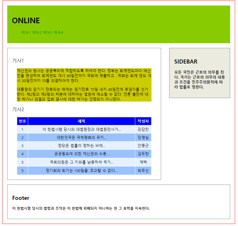 목표 : Semantic Tag를 이용하여 HTML문서의 레이아웃을 설계, CSS를 적용하여 HTML문서에 STYLE을 적용 1. 전체 2단 구조의 HTML 레이아웃 문서 작성 |